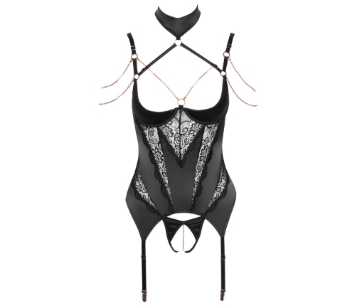 Design: Integrated underwired shelf bra with lightly padded cups enhances the natural shape, while adjustable cleavage straps lead seamlessly to a coordinating choker for a unique silhouette.
