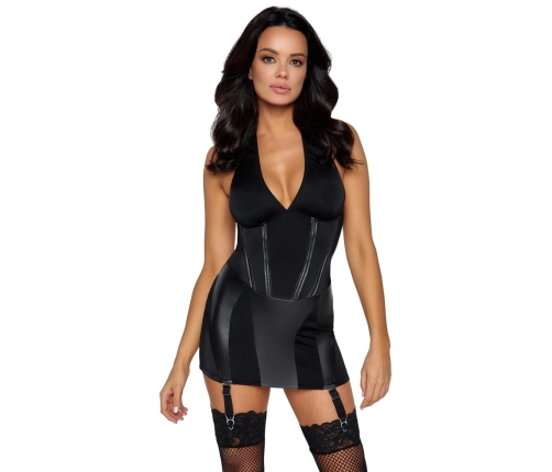 This exclusive set features a short, figure-hugging suspender dress crafted from soft, elastic fabric with elegant matte black inserts. Designed to provide maximum comfort and a distinctive visual effect, the dress adapts seamlessly to your body thanks to its high-quality stretch materials. The halterneck design with a secure clip fastening offers optimal support, while the decorative, adjustable lacing at the lower back ensures a custom fit and a unique design accent.