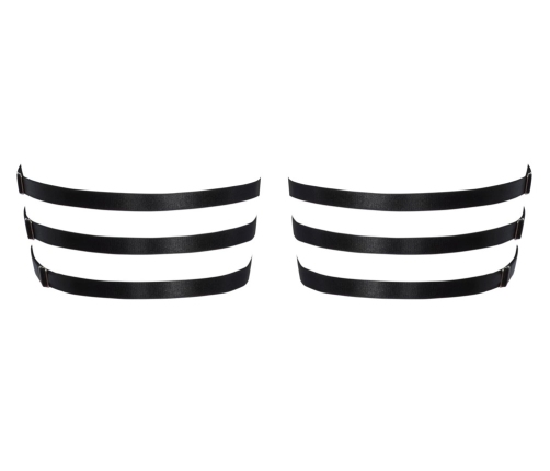 The triple-band construction ensures a contemporary look, while the adjustable system allows for a tailored, secure fit. Each garter is enhanced with elegant silver-coloured rings and sparkling rhinestone accents, adding a unique decorative element that stands out. For added versatility, the garters feature removable and adjustable suspender straps, making them adaptable to various outfits and preferences.