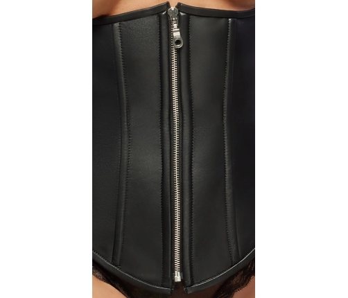 The corset features integrated, flexible shaping bones that enhance the silhouette, providing a beautifully contoured fit. The full-length front zipper allows for effortless dressing and undressing, while the halterneck is equipped with adjustable buckle fasteners to ensure a personalized and secure fit. Silver-coloured metal details add a refined touch to the classic black design.