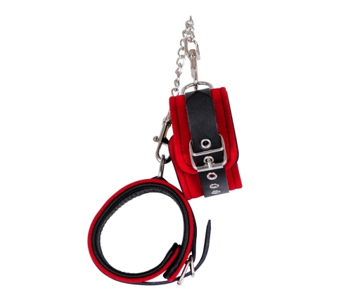For added versatility, the cuffs are equipped with sturdy D-rings and come connected by a removable metal chain (10 cm in length) with practical snap hooks, allowing for various possibilities of connection and play. The combination of high-quality split leather and reliable metal hardware guarantees longevity and ease of maintenance.