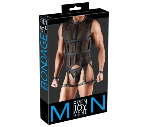 Set includes: Mesh shirt with thigh harnesses, open back jockstrap, 2 adjustable handcuffs with chains