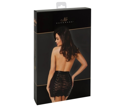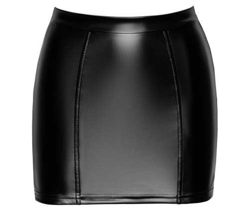 This elegant mini skirt from Noir expertly combines a fashionable black powerwetlook front with a striking lace panel at the back, creating a sophisticated contrast of textures. The rear features a transparent lace insert, adorned with decorative, elastic lacing threaded through sleek metal eyelets, adding a touch of contemporary design to the classic silhouette.
