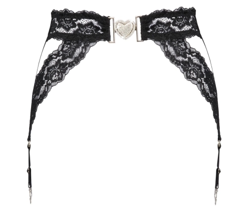The front features a decorative heart-shaped fastening with a sparkling finish, adding a refined touch to the overall design. Both sides are equipped with glitter-adorned rings and two fully adjustable suspender straps, allowing for a personalized fit and easy attachment of stockings. Silver-coloured hardware highlights the exquisite attention to detail, making this belt an ideal addition to any lingerie collection.
