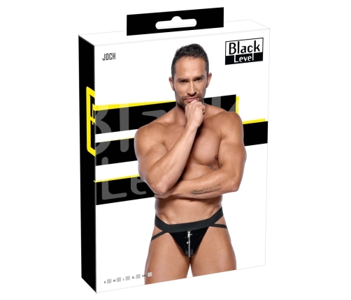 The anatomical pouch, highlighted by the silver-coloured zip, offers both a unique accent and practical utility. Made from 100% polyester with a durable polyurethane coating, the surface is smooth, easy to clean, and highly resistant to wear. This jockstrap is ideal for anyone seeking a combination of avant-garde aesthetics and reliable support.