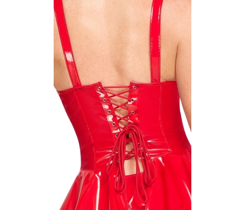 This two-piece set features a long peplum top crafted from glossy, high-quality vinyl with an intense red finish. The top stands out with its flattering low-cut neckline and practical metal zip at the front, allowing for easy and secure closure. For a tailored fit, the top is equipped with adjustable lacing at the back, ensuring it contours smoothly to your body shape. Silver-tone hardware and decorative press studs on the wide shoulder straps add a touch of modern elegance, while the straps themselves can be adjusted to suit your preferred look and comfort.