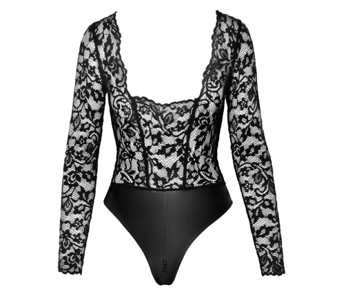 Cosy long-sleeved bodysuit from Noir with a top made of soft, stretchy lace and briefs in an elegant power-wet look. Extra low-cut, with a practical zip at the crotch.