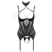 For added versatility and style, the set includes removable rhinestone chains that drape gracefully across the chest and shoulders, attached with convenient snap hooks. The set is completed with a coordinating crotchless string panty made from stretch satin, featuring a detachable decorative chain detail for a customizable look. Stockings are not included.