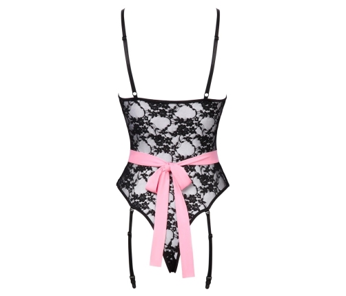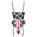 The bodysuit is engineered with fully adjustable shoulder straps, ensuring a tailored fit for various body shapes. The removable suspender straps enhance versatility, allowing customization according to your preferences. The open design at the crotch area adds distinctive functionality to the piece, while the stretchable material ensures ease of movement and a perfect fit.