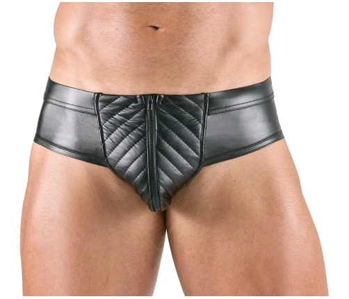 The front is equipped with a padded zip overlaying a visually appealing, stitched pouch, providing both functionality and a striking look. The premium blend of 90% polyester and 10% spandex delivers flexibility and durability, making these briefs an excellent choice for daily wear or special occasions. The smooth, matte surface enhances the contemporary aesthetic while maintaining optimal comfort.