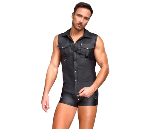 Functional details such as two chest pockets equipped with D-rings add a modern, utility-inspired accent, perfect for those who appreciate both fashion and practicality. The innovative matte coating not only ensures a trendy appearance but also delivers a soft, smooth touch to the skin. This model is ideal for a variety of events, whether casual gatherings or themed occasions, making it a versatile addition to any wardrobe.