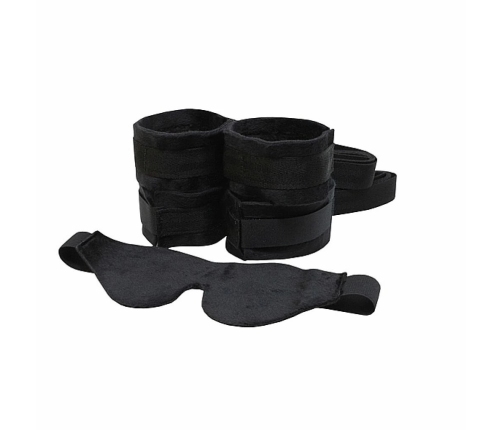 Includes: 4 soft, adjustable wrist and ankle cuffs, 4 nylon connecting straps, 1 plush blindfold