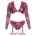 The top boasts a beautiful V-neckline adorned with a heart-shaped pendant, while the matching briefs feature a decorative heart charm at the front waistband. The briefs present a unique design with removable and adjustable velvet suspender straps, allowing for a personalized fit and versatile styling. The soft polyamide-spandex blend ensures breathability and all-day comfort, while the intricate lace texture and thoughtful details create an elegant appearance.