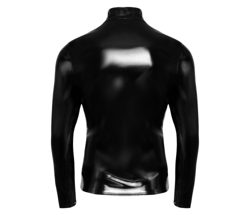 This striking black long-sleeved shirt combines a glossy vinyl surface with dynamic transparent mesh panels, creating a visually captivating effect. The elevated stand-up collar and a full-length, two-way front zipper offer both convenience and a touch of contemporary flair. The shirt is made from flexible, body-contouring fabric, ensuring a comfortable fit while maintaining a bold, fashionable appearance.