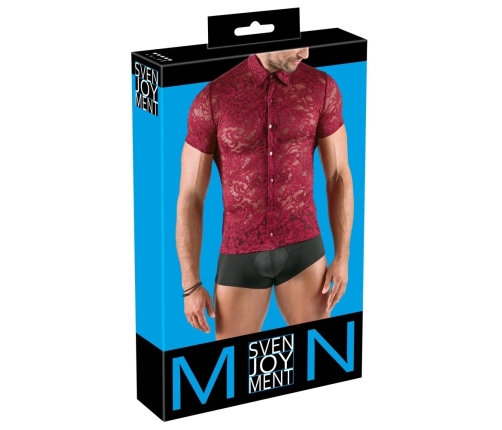 This shirt is expertly crafted with a contemporary design, featuring short sleeves, a classic collar, and a full-length button-down front for easy wear and versatility. The entire garment is made from premium dark red lace fabric, beautifully detailed with an intricate floral pattern that adds a refined touch to any wardrobe.
