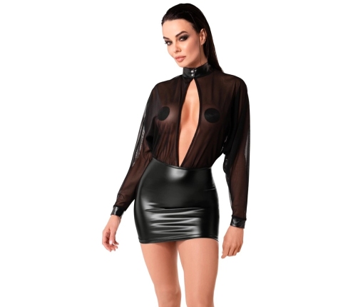 The fitted, short skirt section is also constructed from the signature powerwetlook material, ensuring a body-hugging fit that remains comfortable due to the fabric’s soft and stretchable qualities. The thoughtful blend of materials offers a balance of structure and flexibility, allowing for ease of movement and a flattering fit.