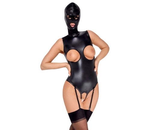 An integrated head mask, made from the same soft vegan leather, adds an element of intrigue. The mask includes practical openings for the eyes and mouth, ensuring clear visibility and breathability. The adjustable and removable suspenders allow for versatile styling options, letting you tailor the fit and appearance to your preference. A discreet zipper at the back makes dressing and undressing easy and convenient.