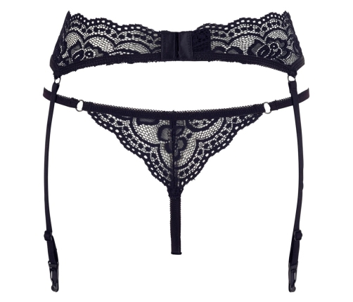 This exquisite two-piece set is crafted from delicate, high-quality stretch lace, offering a refined and stylish look. The set includes a minimalistic string with comfortable, elasticated straps for an optimal fit, and a coordinating suspender belt adorned with adjustable suspender straps. The suspender system is designed to fit seamlessly with a wide range of stockings (not included), allowing you to personalize your outfit according to your preferences.