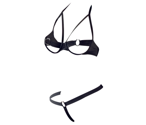 The set also includes a matching thong crafted with a comfortable, stretchy waistband and a coordinating metal ring detail at the front. The thong is designed with a minimalistic fabric strip in the front, ensuring lightweight comfort and a refined appearance. Both pieces are made from a high-quality blend of 85% polyamide and 15% spandex, offering flexibility and durability for repeated wear.