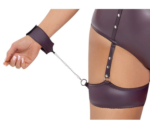 Fully adjustable shoulder straps allow for a personalized fit, while the garment is equipped with suspenders to which the included soft, stretchy restraints can be attached or removed according to preference. The hand and leg restraints are secured with hook-and-loop fasteners for ease of use, and the handcuffs feature snap hook chains that easily connect to the rings on the leg straps. This versatile system allows you to customize the look and function to your style.