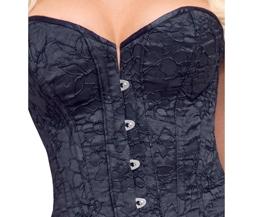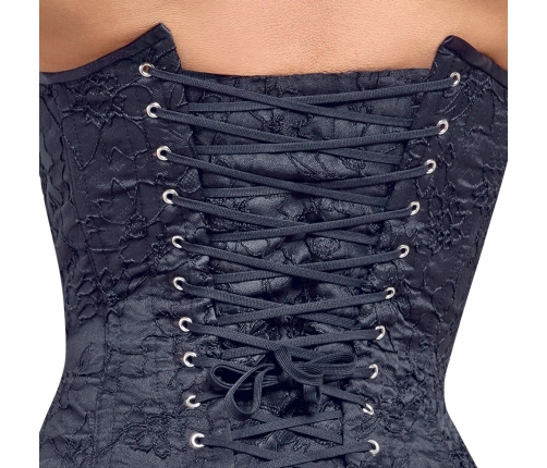 The corsage features a front hook-and-eye fastening system, making it quick and convenient to put on or remove. The back is adorned with full-length lacing, which sits above a protective backing panel so your skin remains discreetly covered at all times. This thoughtful design detail not only provides a customizable fit but also adds a classic touch to the piece.