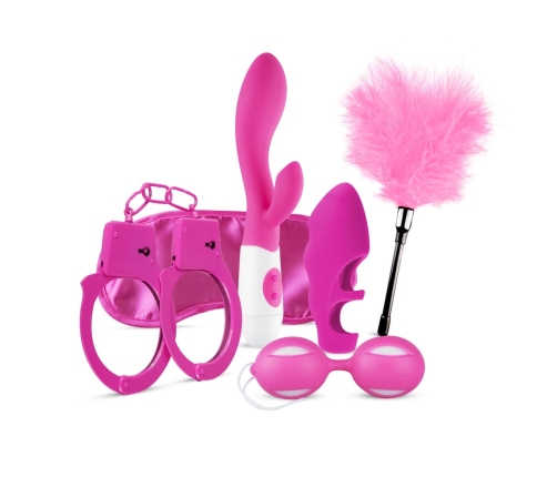 Complete 6-piece set: Includes a pair of metal handcuffs with keys, weighted love balls, a finger device, a rabbit-style massager, a comfortable eye mask, and a feather tickler.