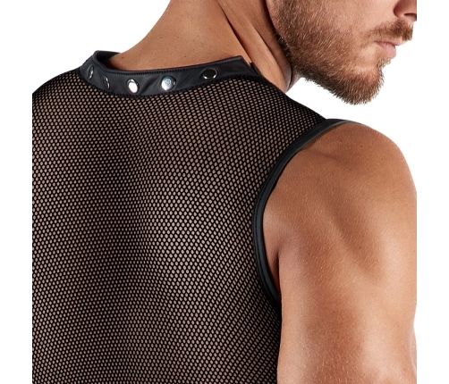 The sleeveless shirt includes securely attached thigh harnesses on the front, easily adaptable to your physique thanks to practical press studs. Multiple metal rings are strategically placed on the sides, allowing you to attach the included handcuffs using snap hook chains for added versatility. The comfortable hand restraints are lined with soft material and are fully adjustable to ensure a snug, customized fit.