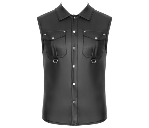 The shirt is equipped with practical press studs running down the front, allowing for effortless wearing and removal. Two chest pockets are adorned with D-ring details, adding a functional, industrial-inspired accent that elevates the overall aesthetic. Constructed from a blend of 90% polyester and 10% spandex, coated with polyurethane, the fabric offers a comfortable, slightly flexible fit that adapts to your body shape while maintaining its eye-catching matte effect.