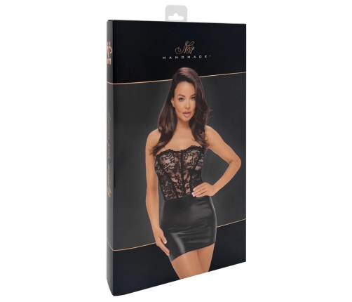 This exclusive model features a unique blend of delicate, semi-transparent lace at the top and a striking, shiny matte powerwetlook skirt. Its anatomic cut ensures a tailored fit, enhanced by visible, flattering seams at the front for a visually sculpting effect. The back boasts an adjustable corset-inspired lacing system that extends down to the lower part, allowing easy customization to suit your shape.